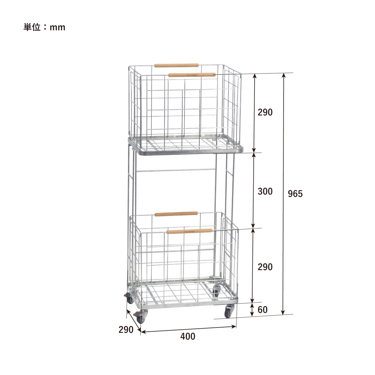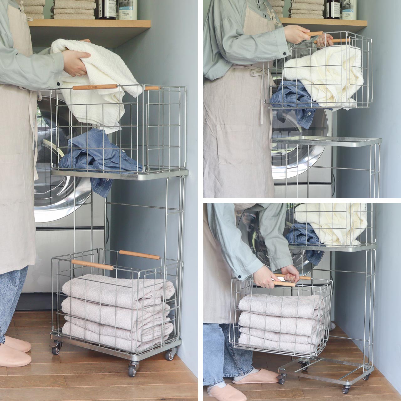 容量約30Lのバスケットが2つ付いており、2段式なので洗濯物の分別がしやすく、おしゃれ着や色柄ものなどを分けて収納するのに便利。