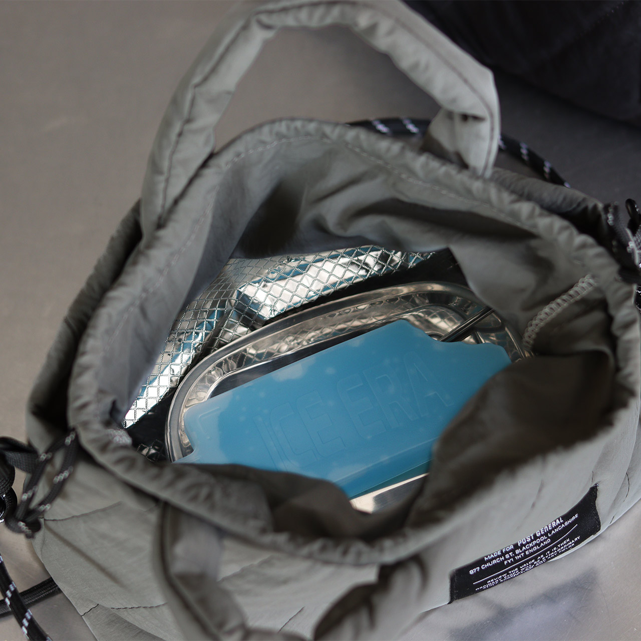 開口部は巾着仕様になっており、外からアルミシートが見えにくく、普段使いのバッグのようなデザインに仕上げました。