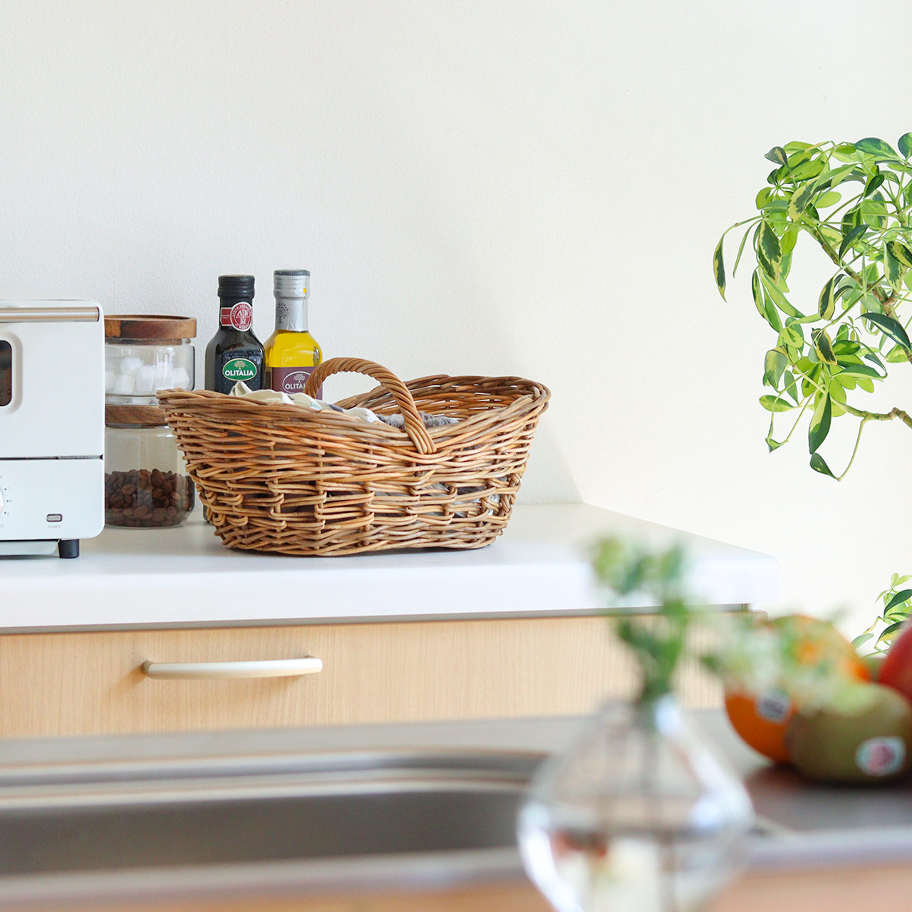 果物やキッチン周りの小物など、ざっくり入れるだけでも絵になります。