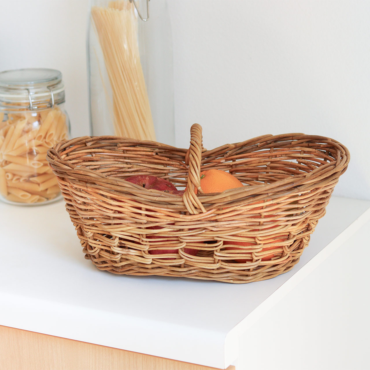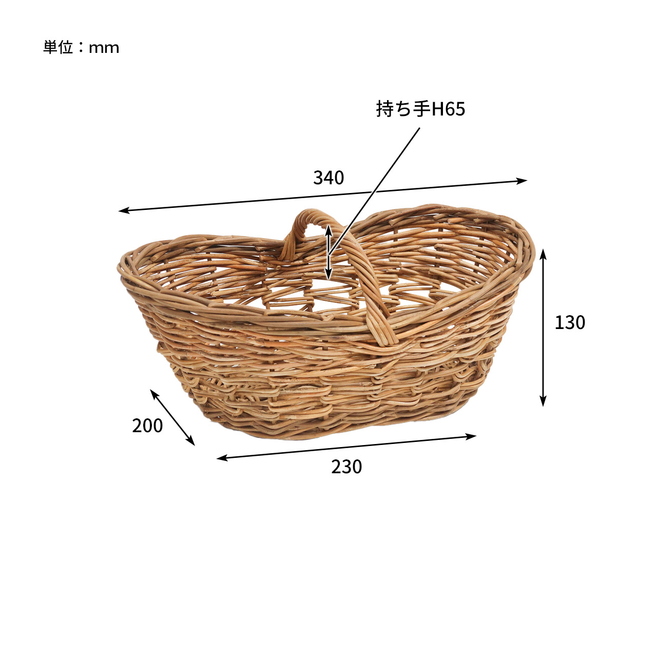 天然素材の皮付きラタンを贅沢に使用した、温かみのあるオーバル型のローバスケット。