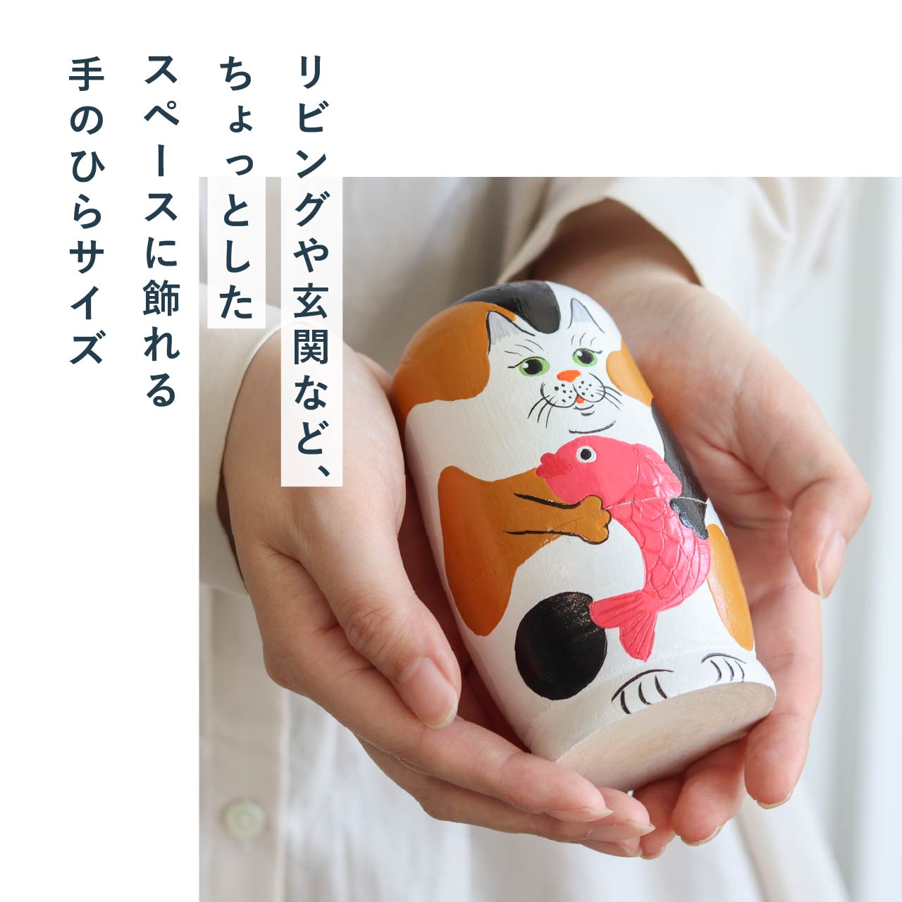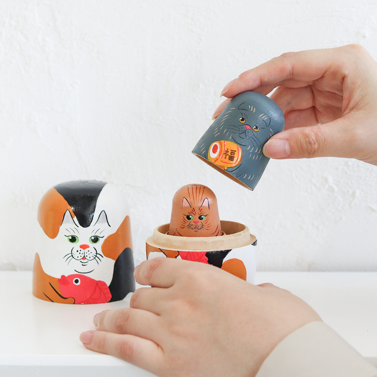 鯛や打ち出の小槌、招き猫、だるま、鏡餅など、縁起物を持った猫たちのイラストが次々と現れる、手のひらサイズの木製マトリョーシカです。