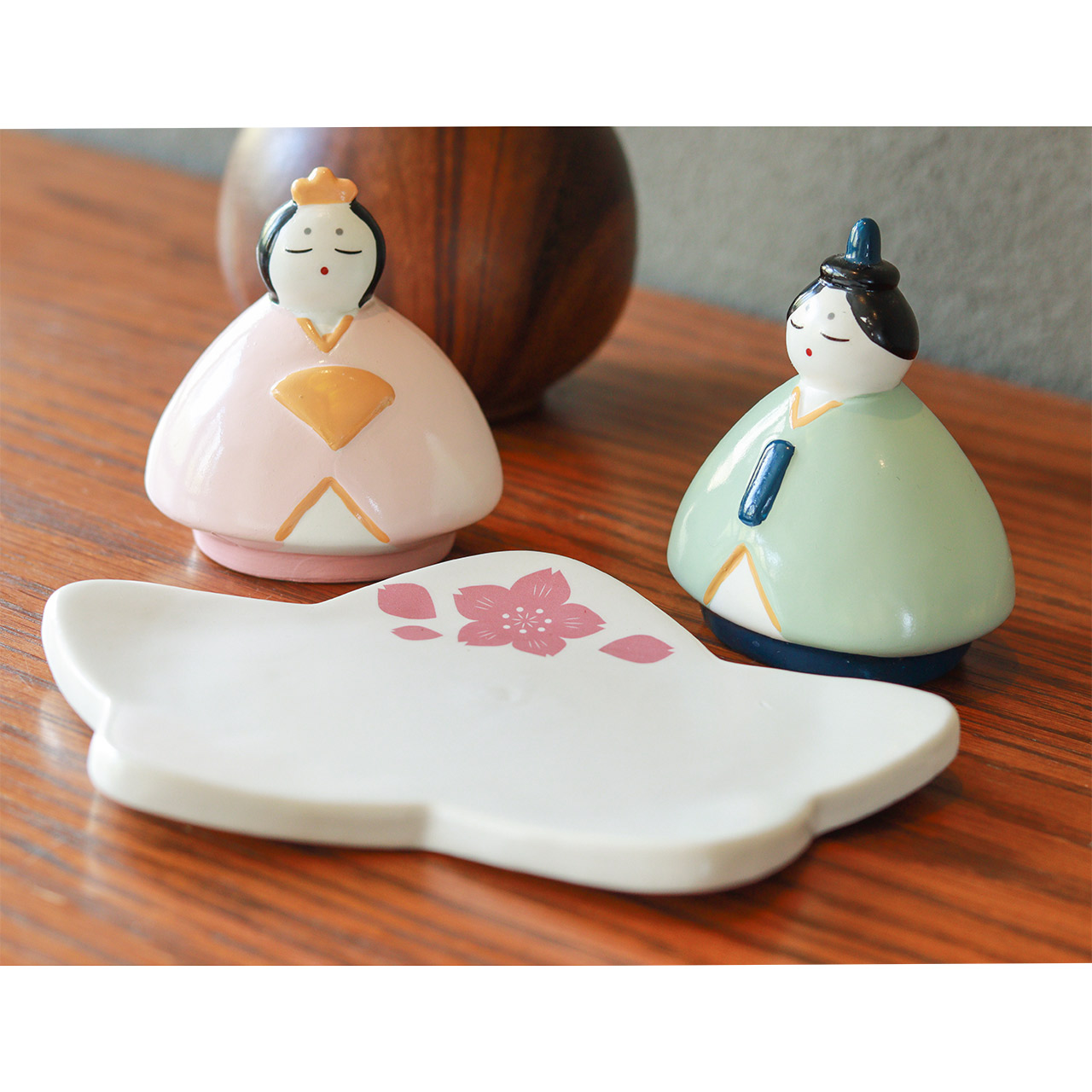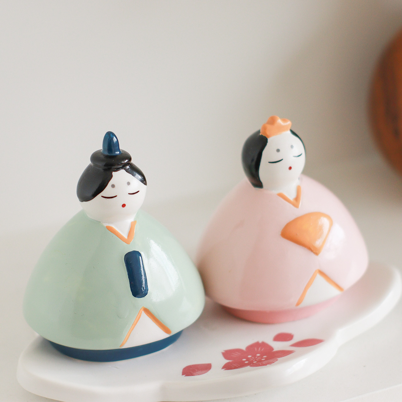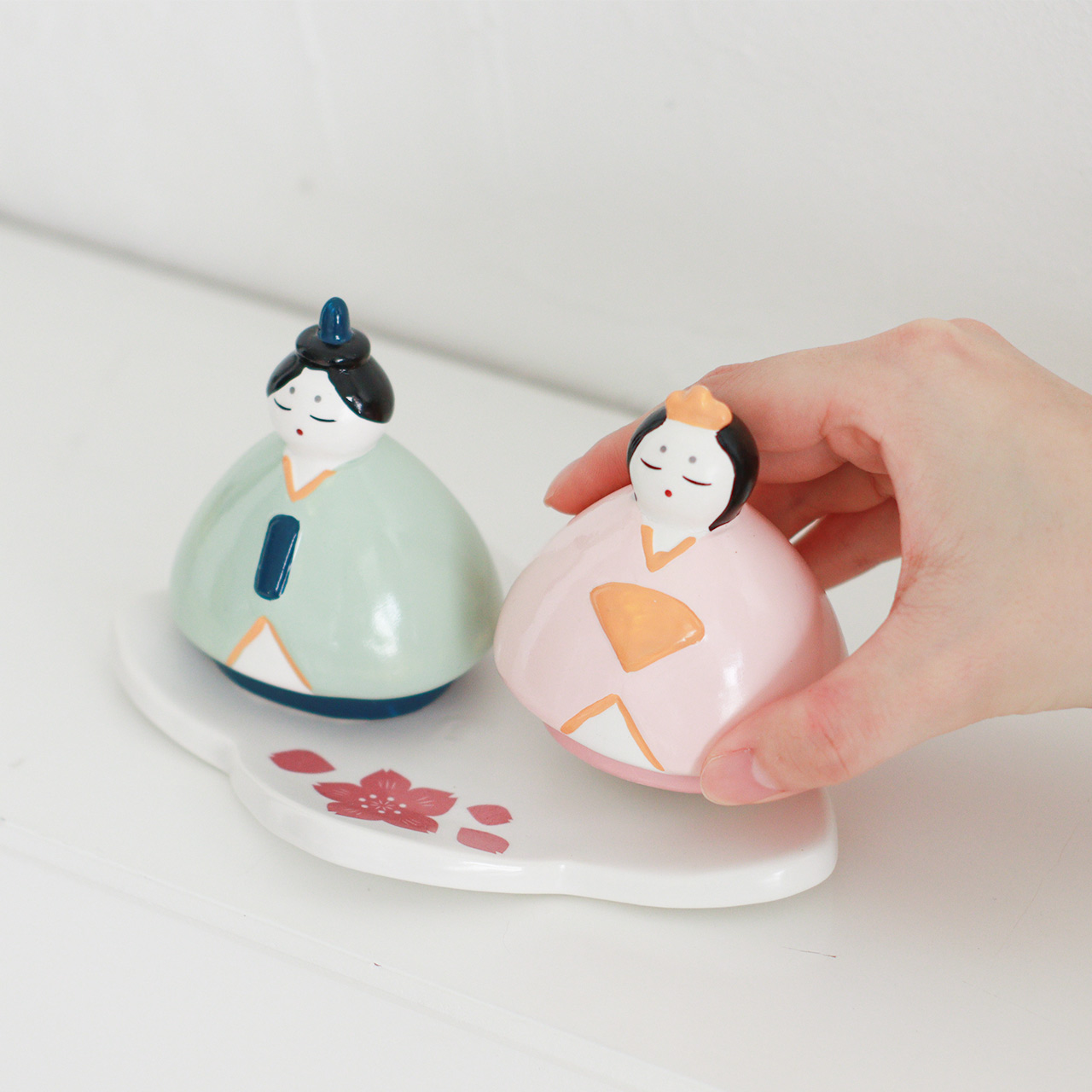ころんとしたフォルムが愛らしい、手のひらサイズの磁器製ひな祭りオブジェ。