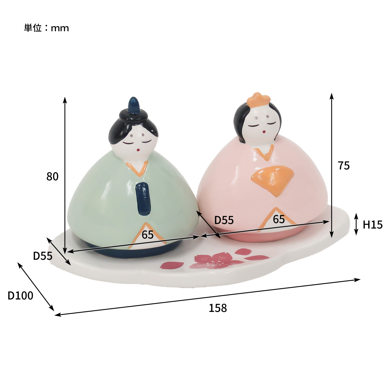 | サイズ | 約 w158×d110×h15mm(台座) 約 w65×d55×h80mm(お内裏様) 約 w65×d55×h75mm(お雛様) 重量:約 335g |