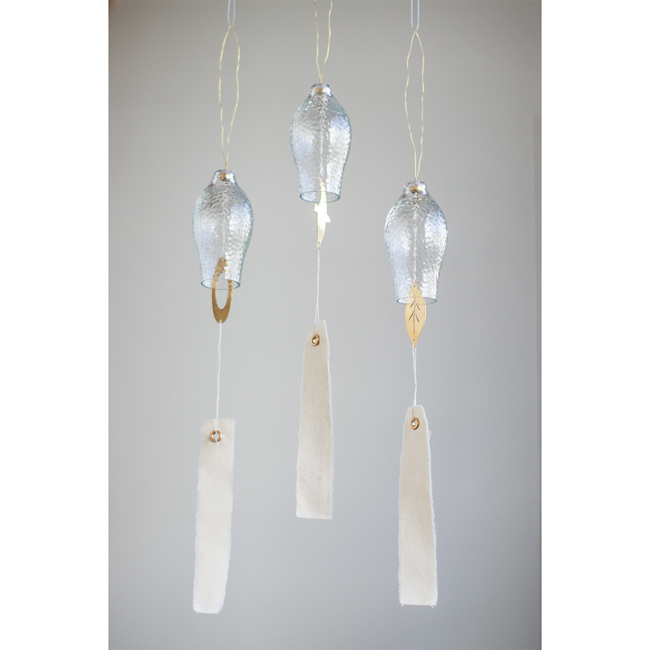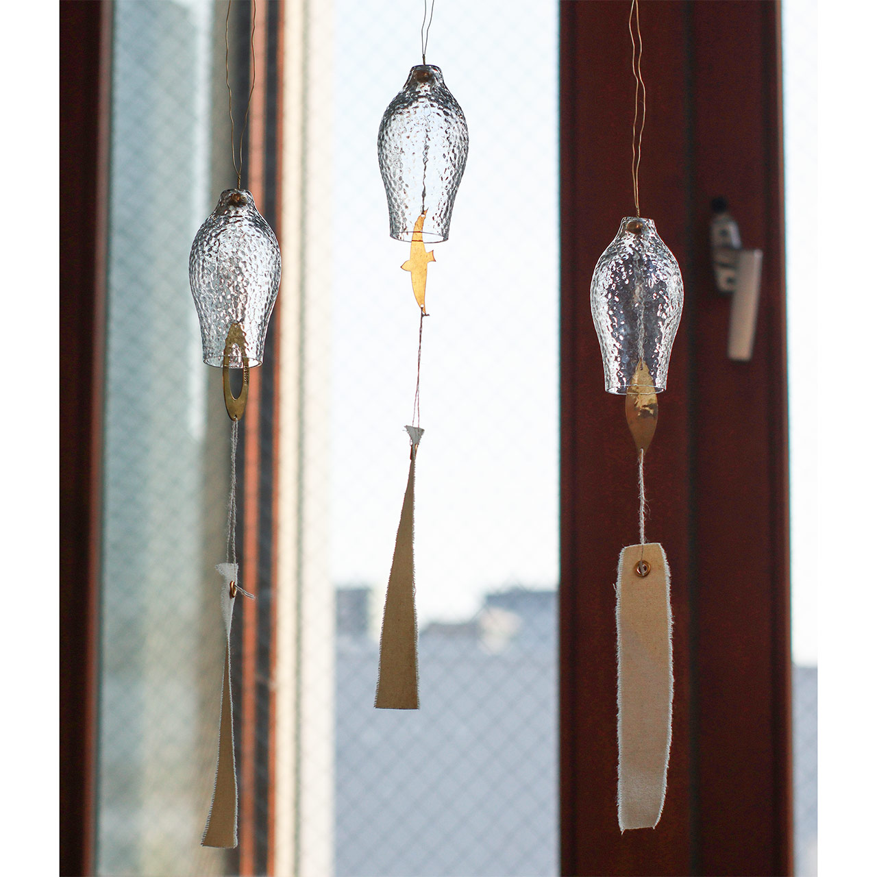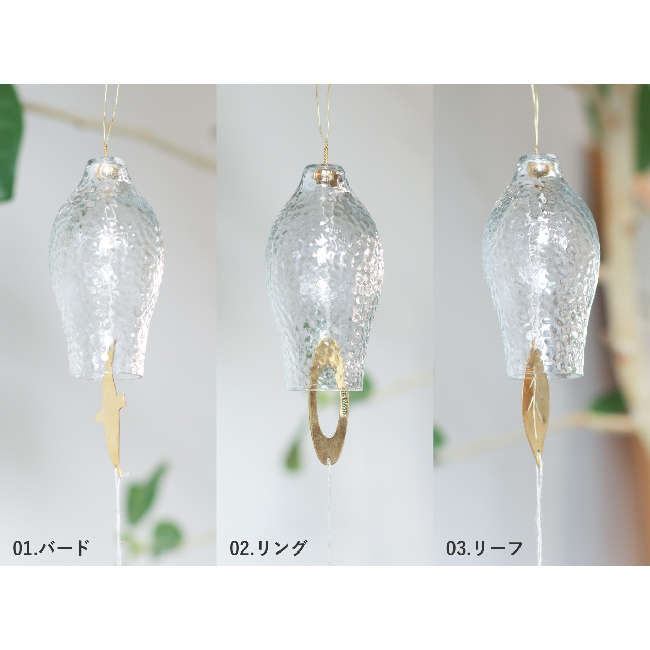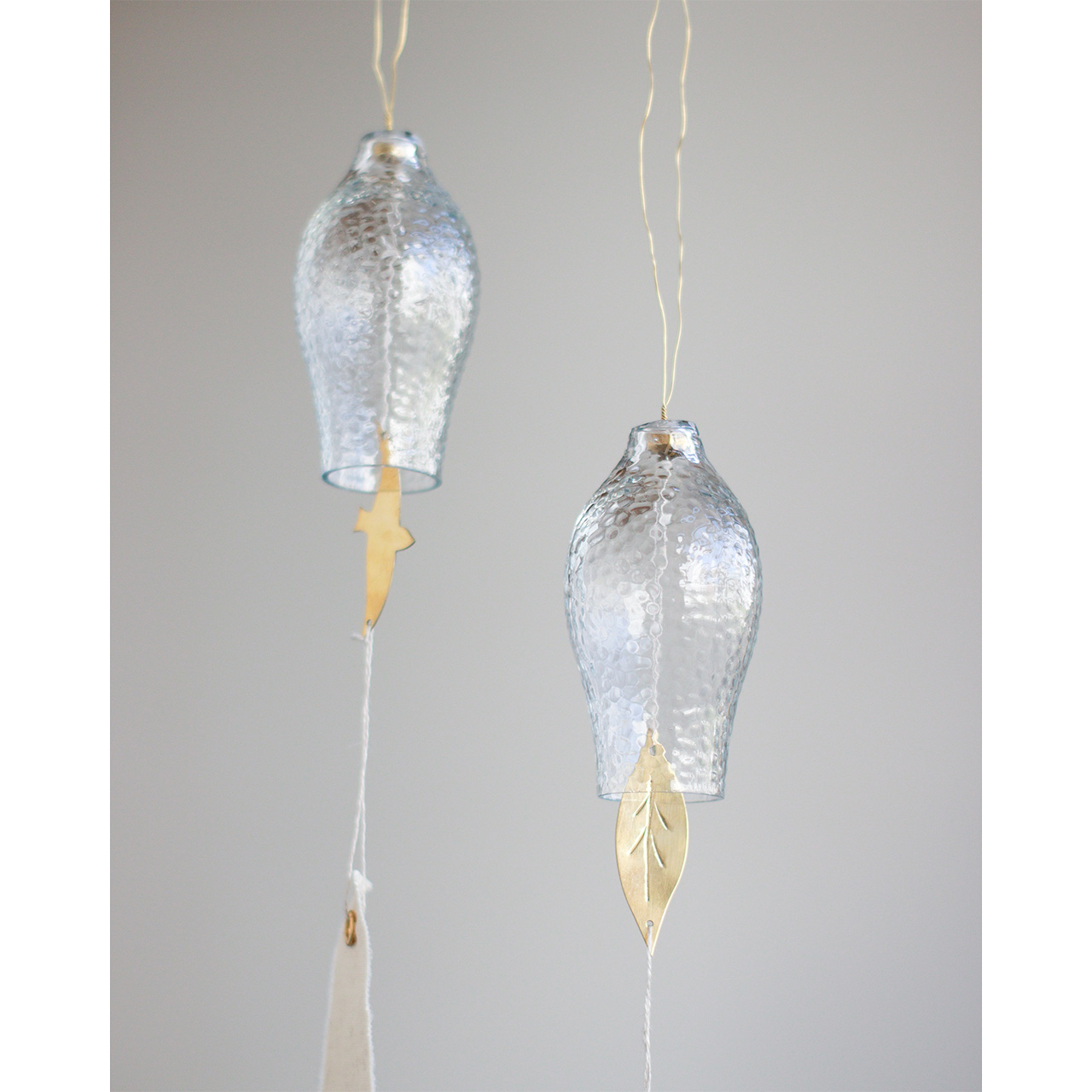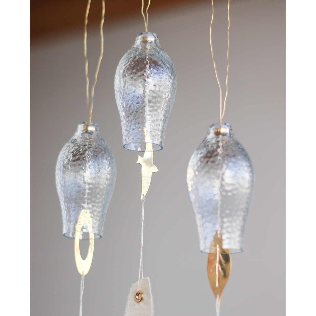 それぞれ異なるデザインで、ガラス部分に真鍮のパーツが当たることで、澄んだ美しい音色が心地よく響きます。