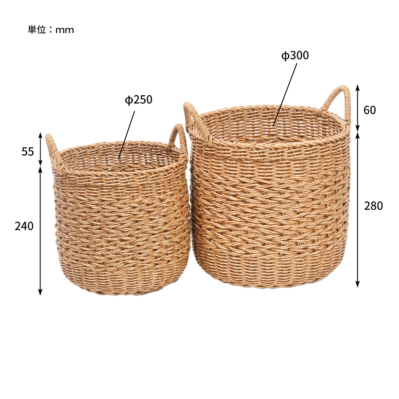 | サイズ | ・Sサイズ size:約 φ250×h240mm(持ち手 h55mm) 重量:約 390g ・Lサイズ size:約 φ300×h280mm(持ち手 h60mm) 重量:約 565g |