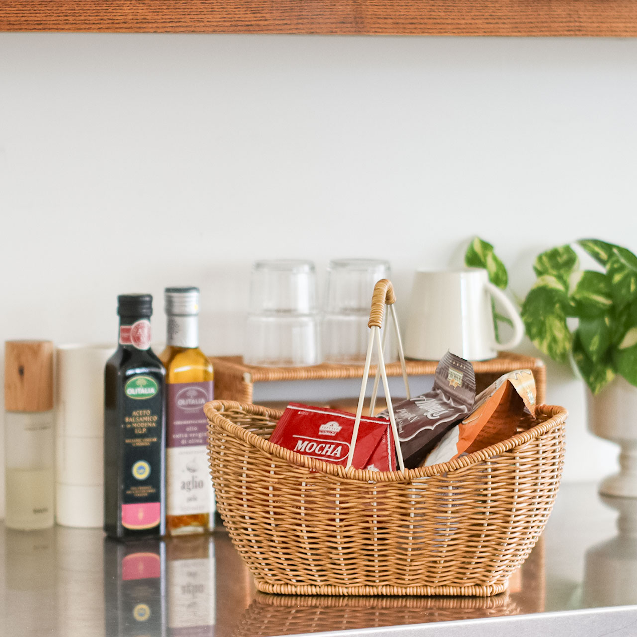 コーヒーやお菓子のストック、調味料、クロス類の収納にはもちろん、リビングやダイニングでの“見せる収納”にもおすすめ。