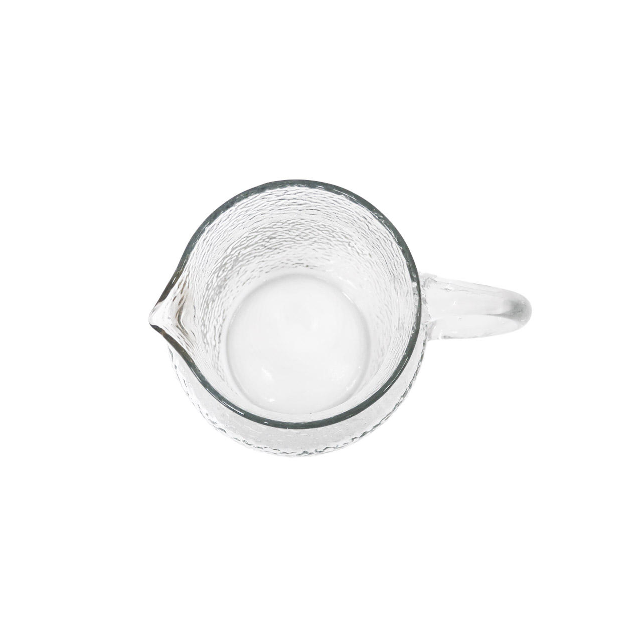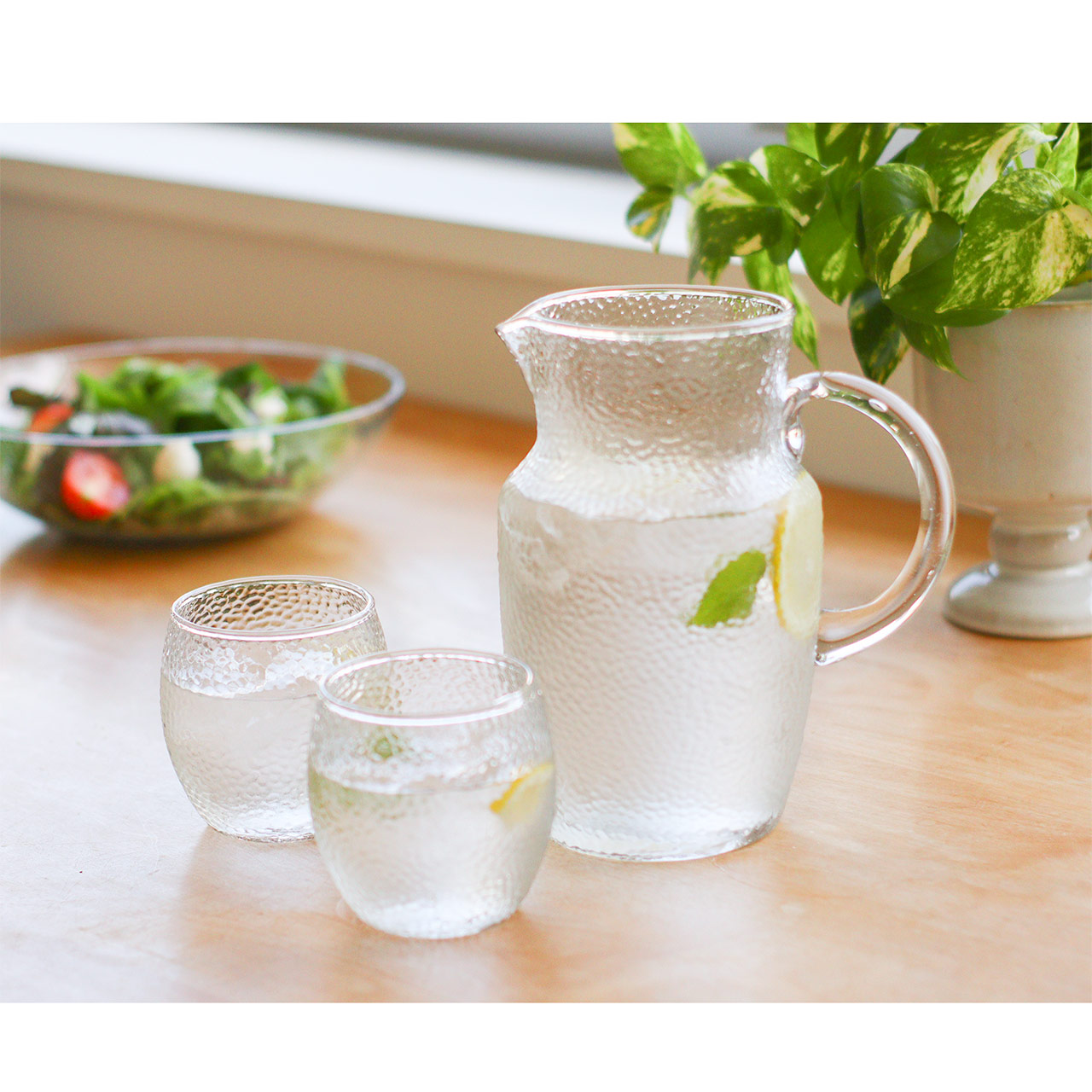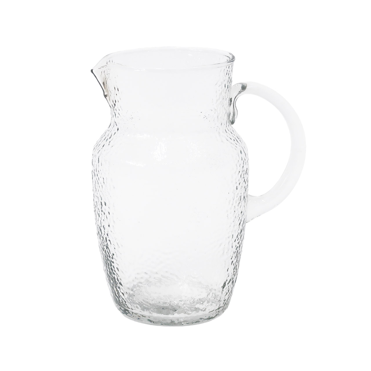 やわらかな曲線と、表面に広がる味わい深い凹凸模様が印象的なリサイクルガラスのピッチャー。