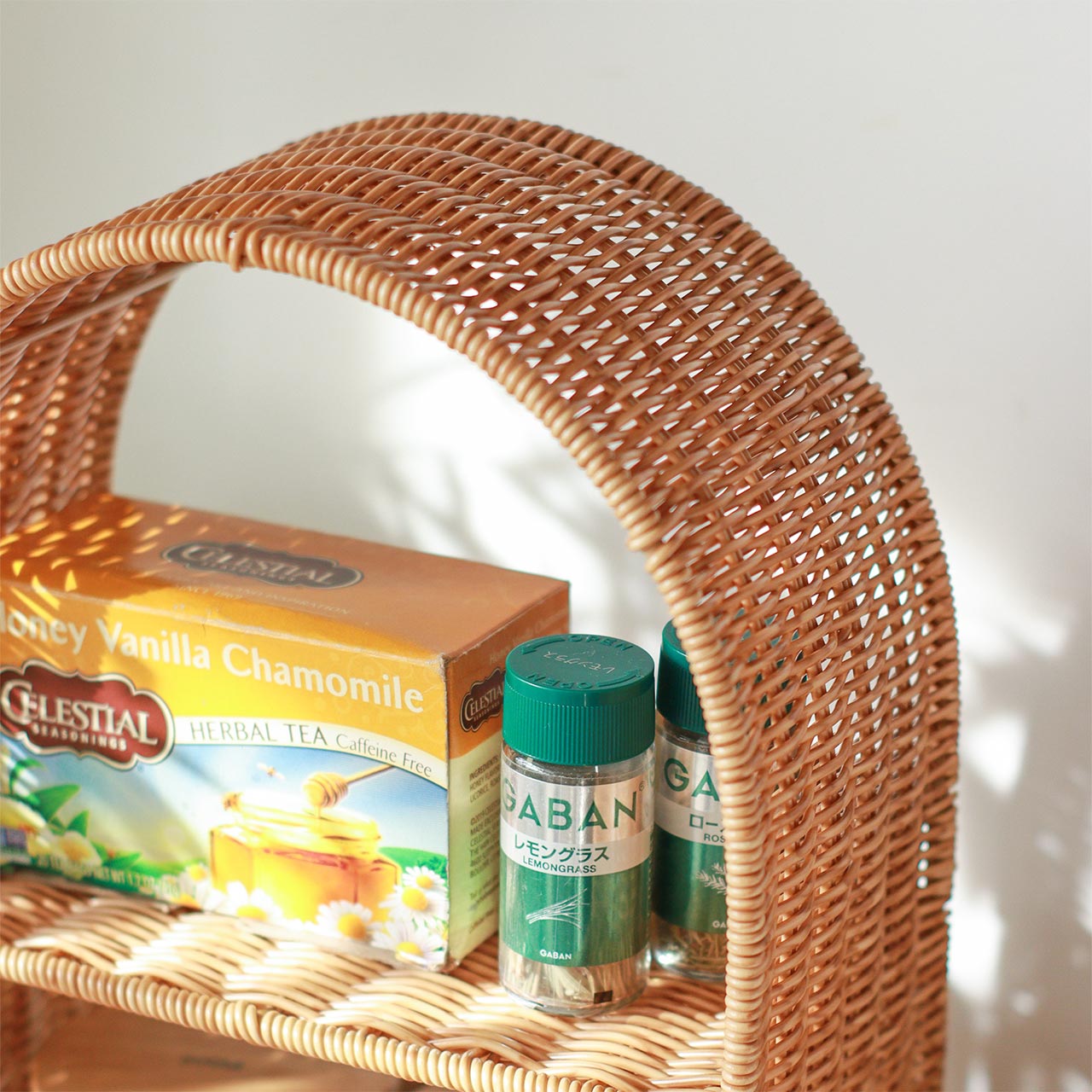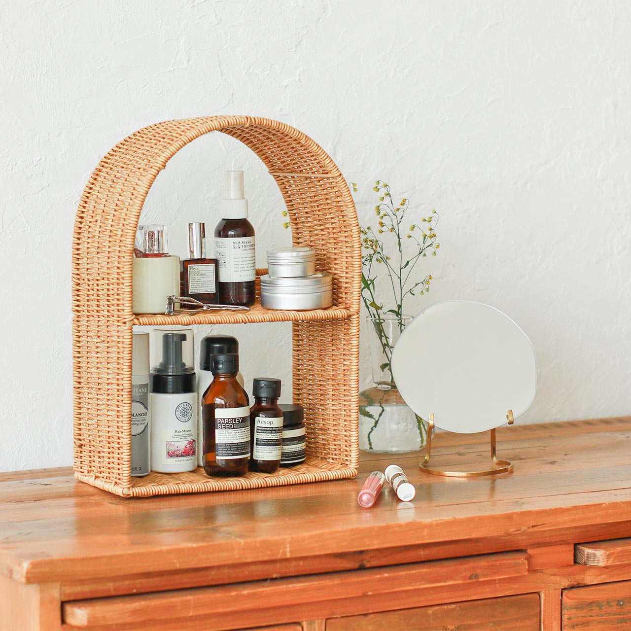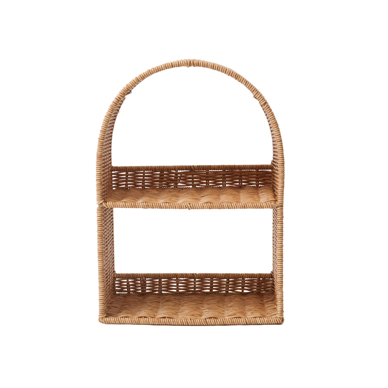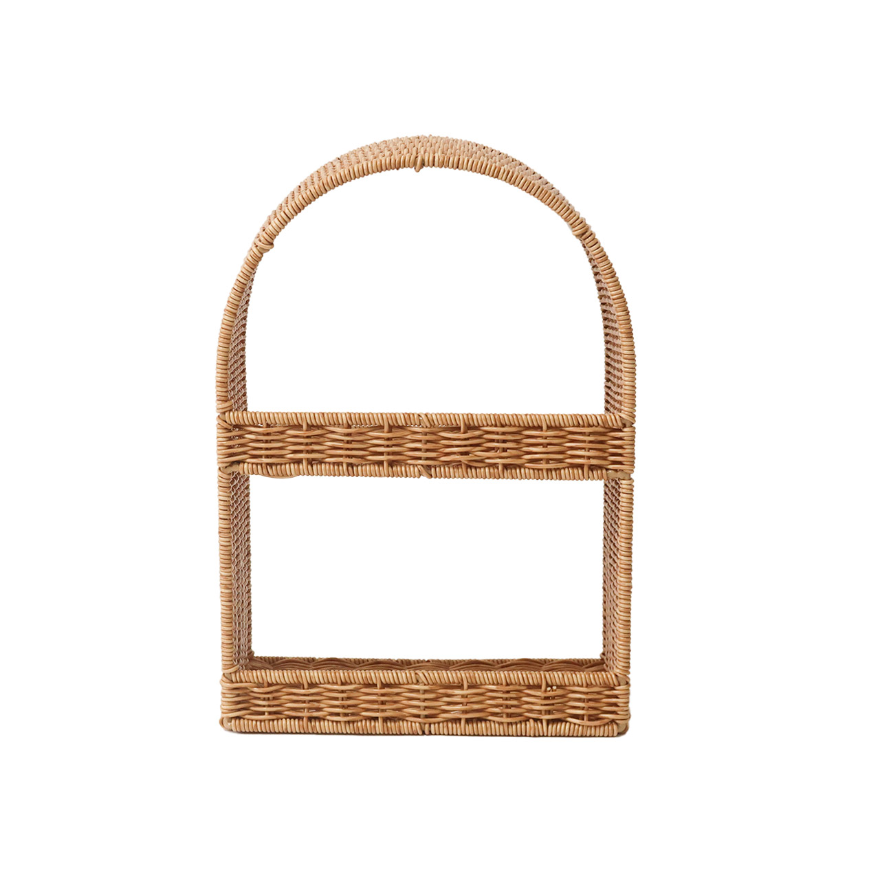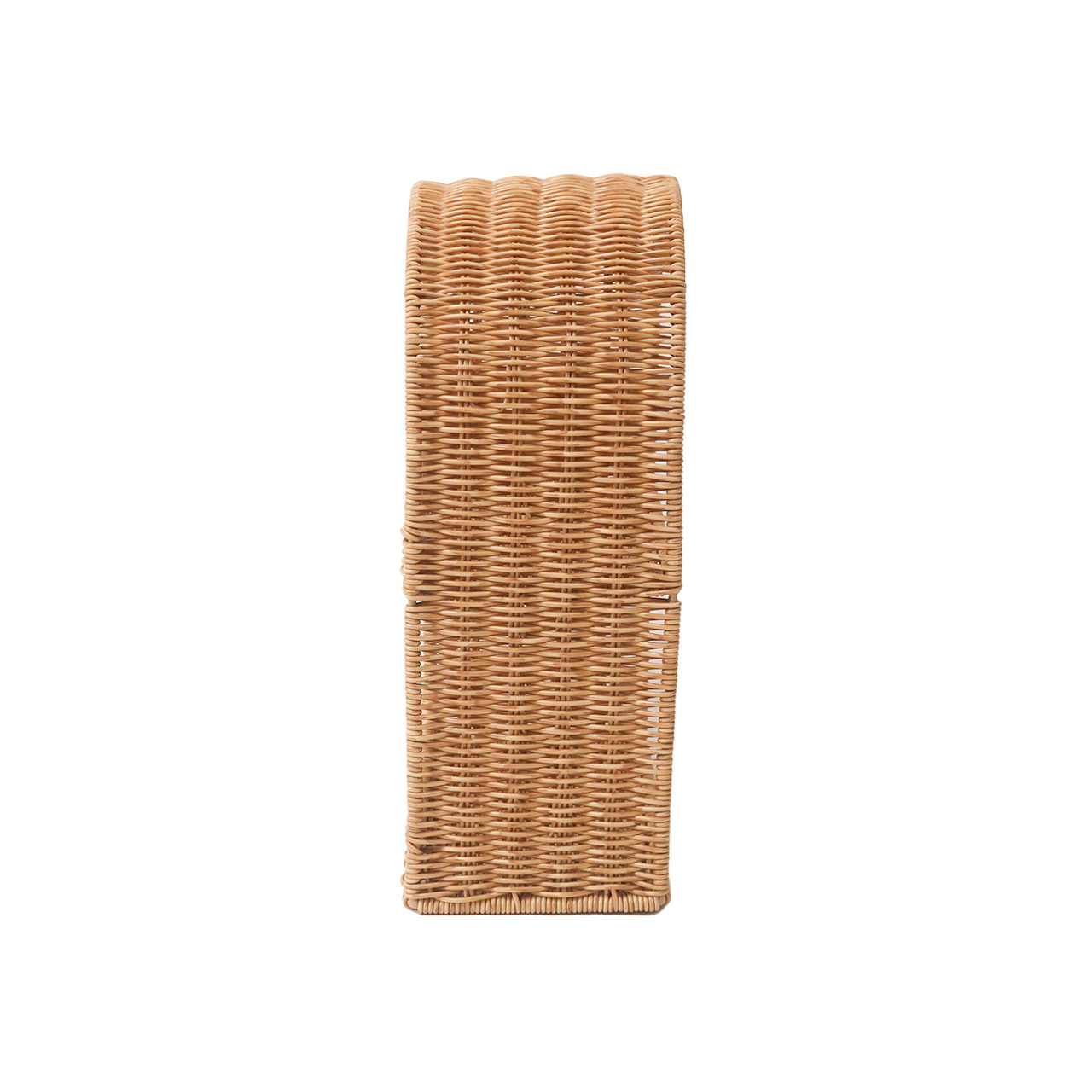 かご編みのナチュラルな風合いと、やわらかなアーチラインが目を引く「ユティル」シリーズの見せる収納シェルフ。