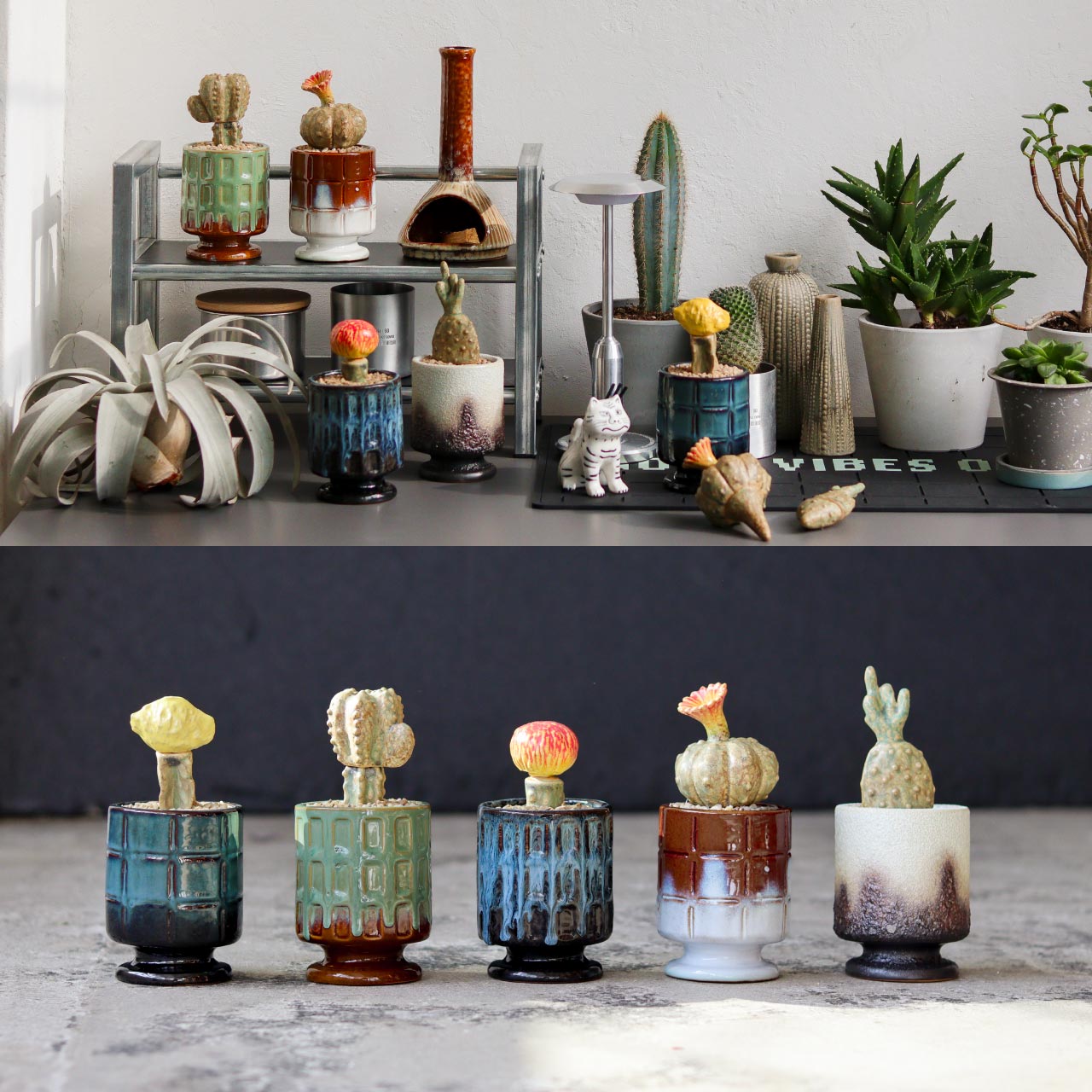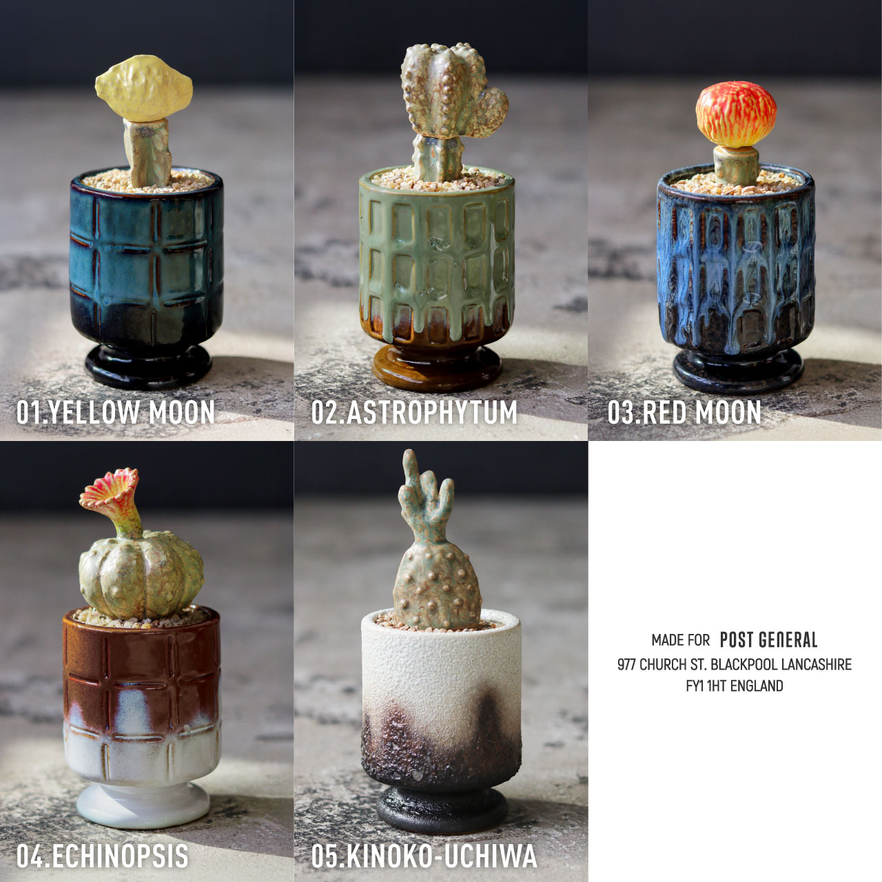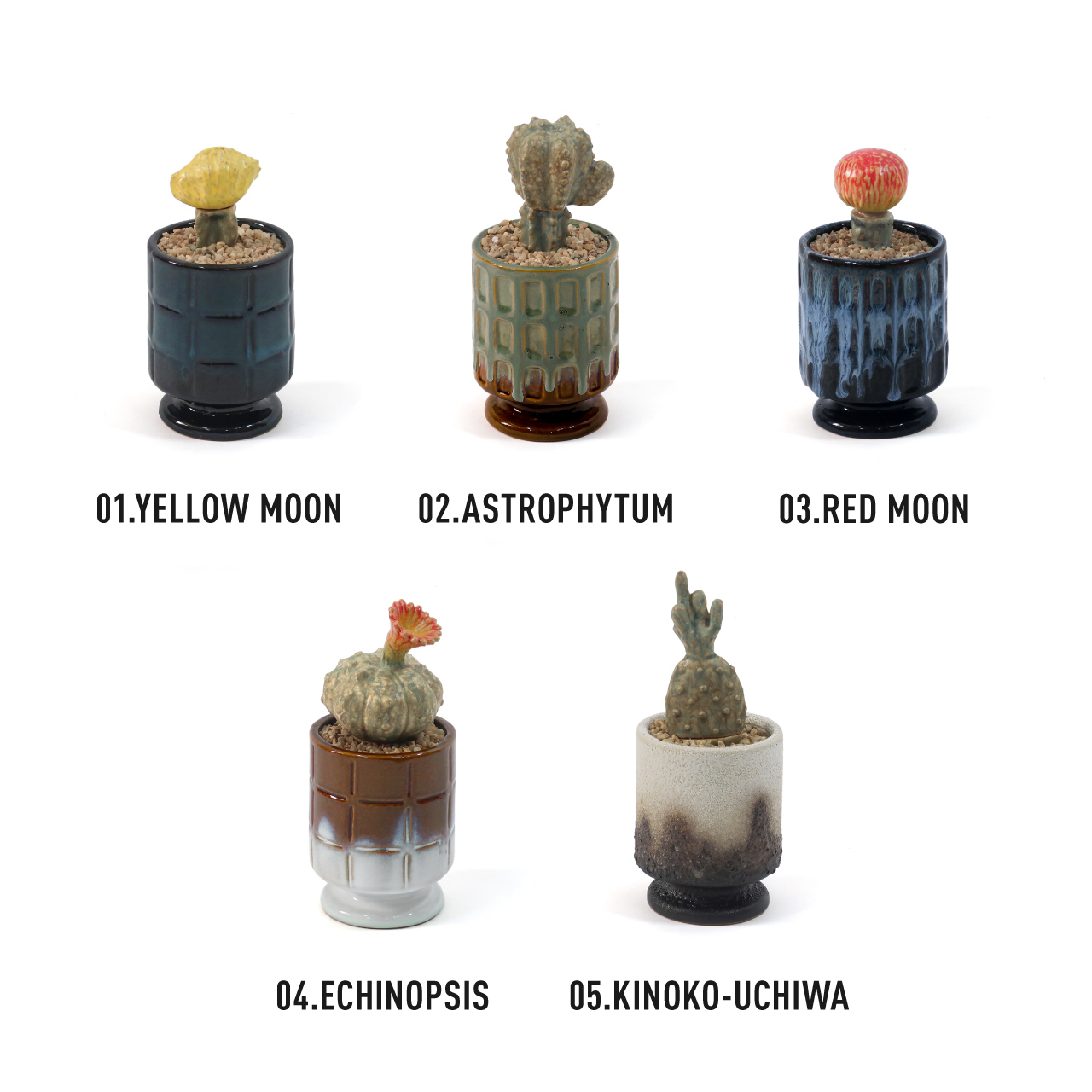 | サイズ | size:約 φ80×h110mm 重量: (イエロームーン)約 370g (アストロフィツム)約 450g (レッドムーン)約 410g (エキノプシス)約 440g (キノコウチワ)約 390g |