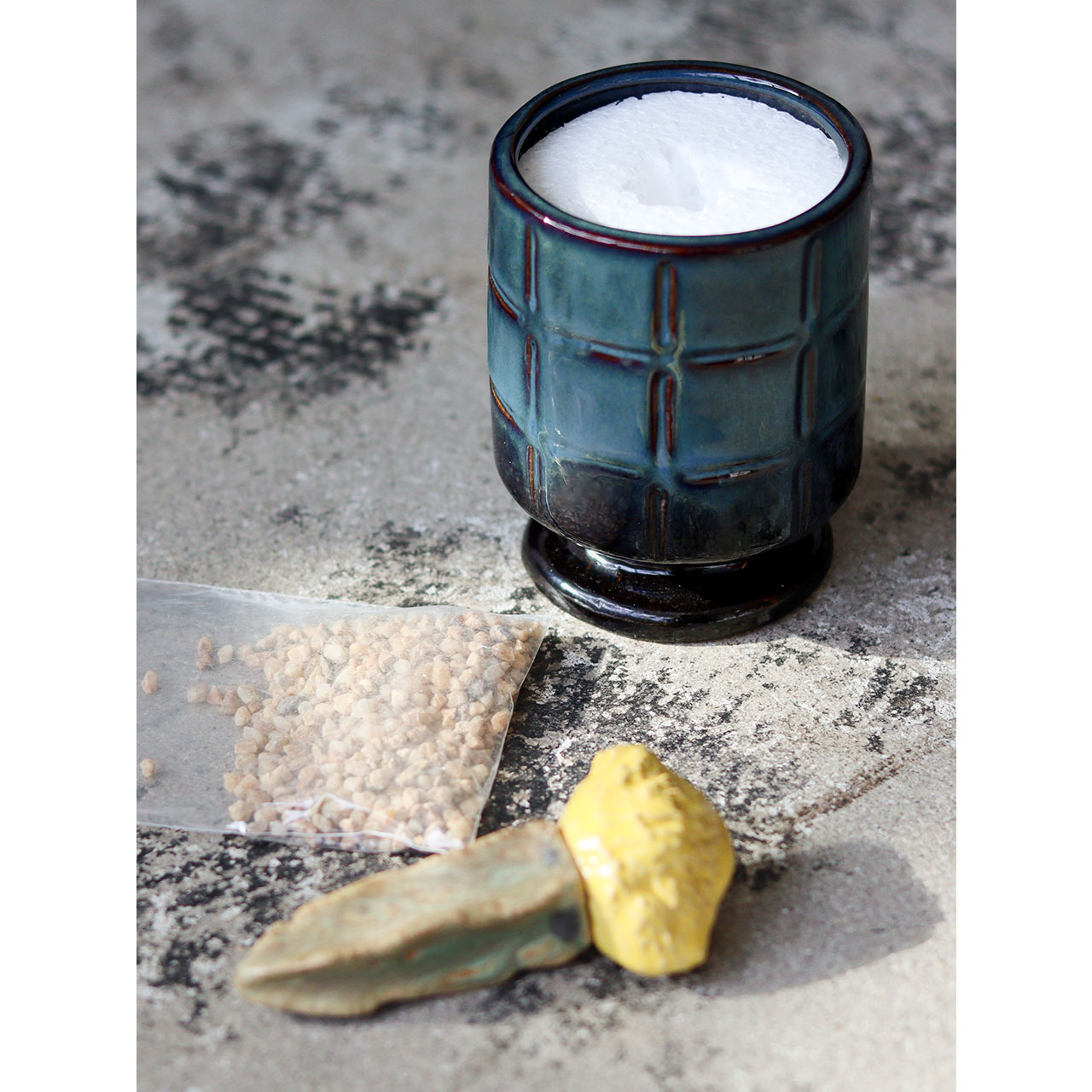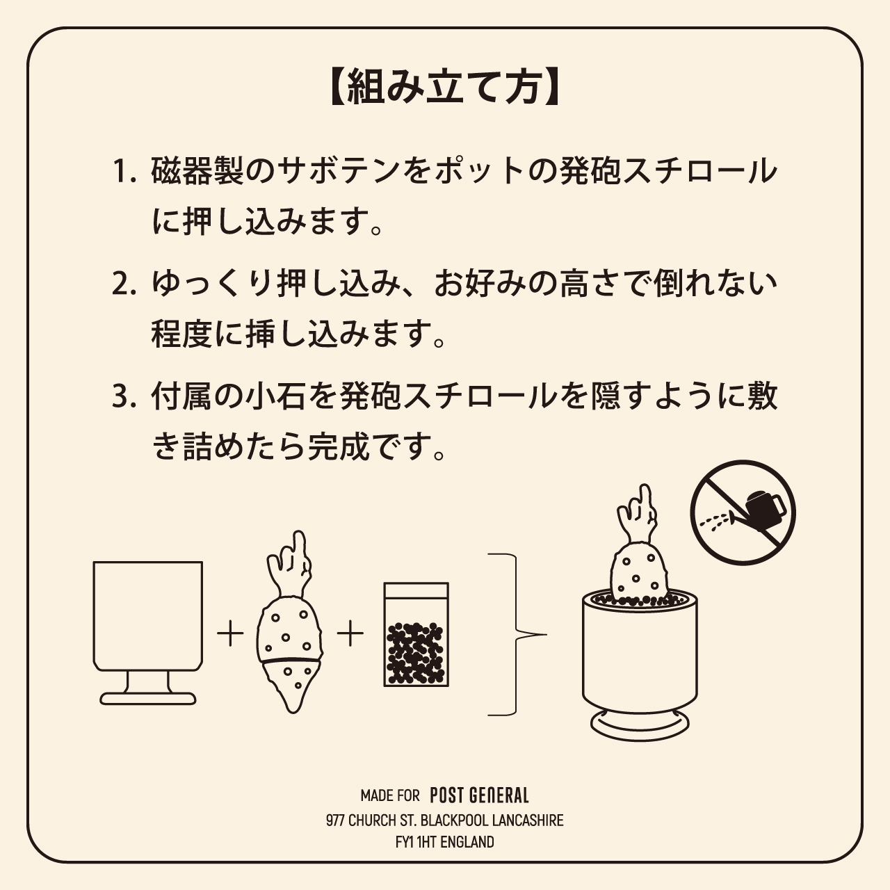 ポットにセットされたスチロールフォームに磁器製のサボテンを差し込み、仕上げに付属の化粧用小石を敷き詰めれば完成します。