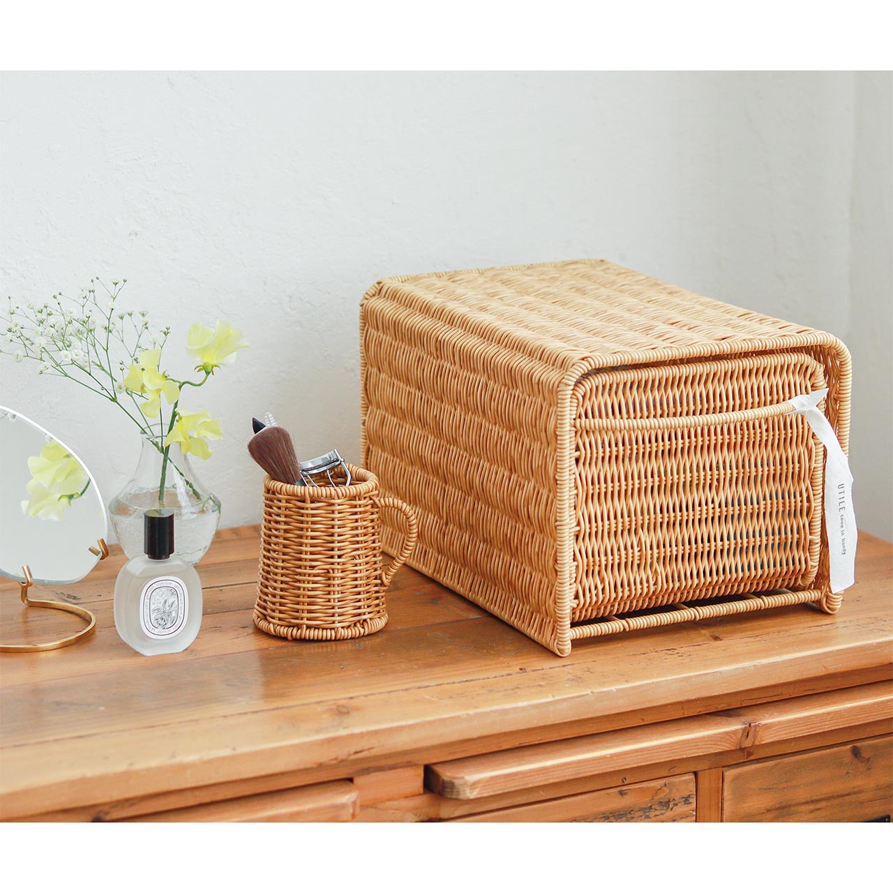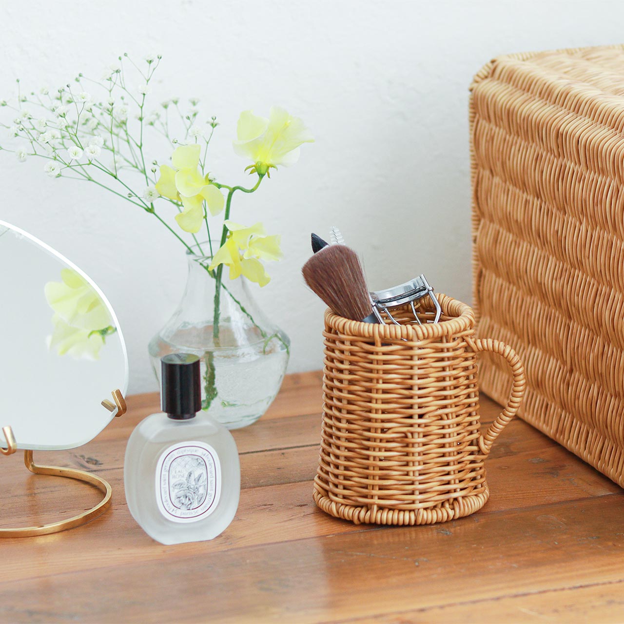 キッチンではカトラリー立てとしてはもちろん、コスメやドライフラワーを飾るアイテムとしても幅広く活躍します。