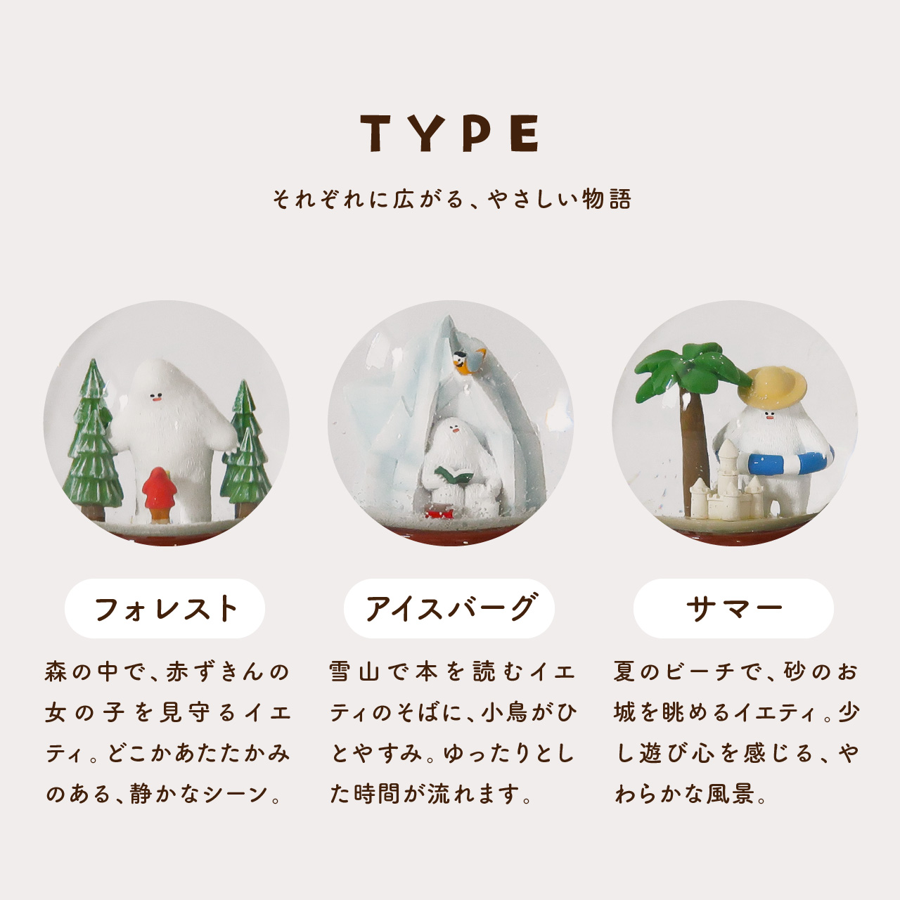 森の中で赤ずきんの女の子を見守る「フォレスト」、雪山で静かに読書を楽しむ「アイスバーグ」、夏のビーチでくつろぐ「サマー」と、それぞれ異なる情景が広がります。